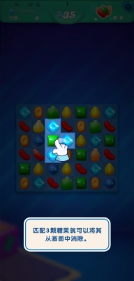 2、我们需要找到三颗同样颜色的糖果,将其连成一条线,然后就可以将其在画面中进行消除;