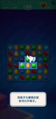 通过消除同色的糖果和汽水瓶,使水平面升高,让泡泡里的小熊浮到糖果串上面才能完成关卡。