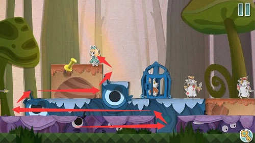 从高台上跳下将老鼠击晕,再把它放进右边的齿轮装置里来触发机关。