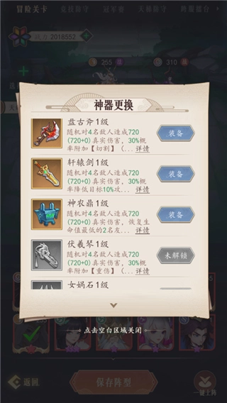 阵容里只能佩戴一件神器,达成神器的解锁条件就能解锁对应的神器,每件神器会依据技能等级呈现出不一样的效果,大家可以自行搭配阵容哦~