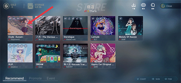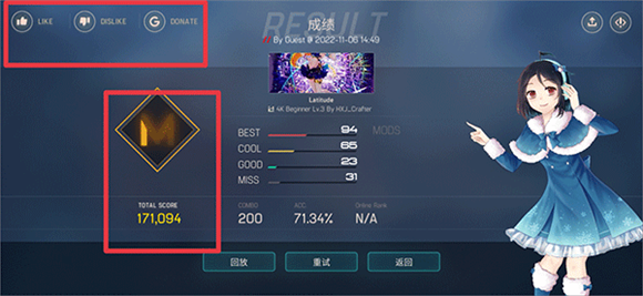 游戏结束后,你可以查看整场游戏的评分;要是喜欢游戏里的音乐,还能点击左上角的按钮给音乐点赞。
