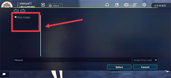 打开后,点击右侧的pickfolder进入手机文件夹,接着找到存放皮肤文件的文件夹并将其打开。