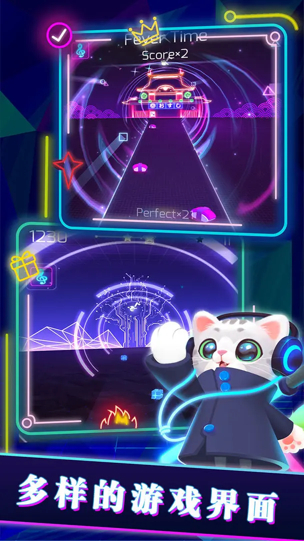 在《进击的音速喵》里,你能和音速小猫一块儿跟着节奏律动,这款游戏挺考验反应力和手速的——音乐节奏越快,你的操作就得越敏捷。你可以从海量曲库中挑选喜欢的歌曲,跟着节拍尽情游玩。游戏内还设置了一些武器道具,能帮你清除前进障碍、冲击更高分数。游戏画面设计得很炫酷,融合了卡通与朋克风格,视觉上让人感觉很新颖。此外,游戏收录的歌曲数量相当丰富,涵盖了多种风格,且均为全球独立音乐人的创作,完全不用担心没有合心意的曲目。