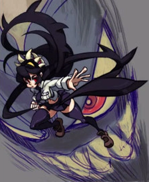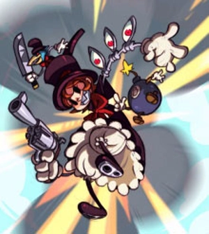 菲莉娅是《骷髅女孩》名义上的女主角,不过像玛丽、帕娜索、瓦伦汀、双形和潘薇儿这些角色,戏份都比她多不少。这或许是因为游戏的多数宣传物料和海报等,都把她当作核心元素来用。