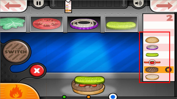 3、再去制作汉堡,依据提示不断加入食材。