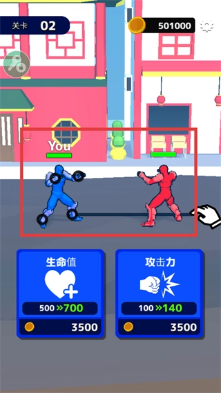 1、在【关卡-02】里,使用【3500金币】来增强蓝色角色的战力,使其【生命值从500提升至700】、【攻击力由100增长到140】。
