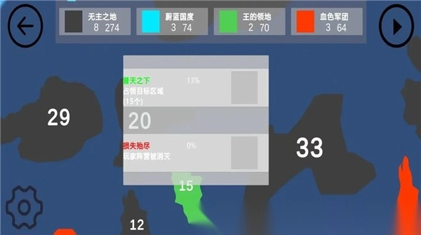 1. 点击绿色区域可进行领土增援操作,点击其他颜色的土地则是发起进攻,当目标土地被转换为绿色时,即表示占领成功。