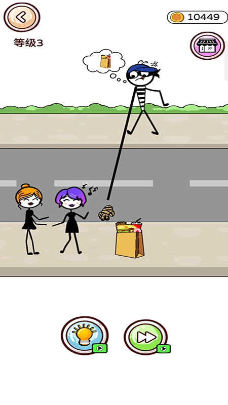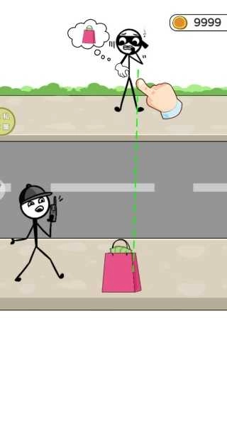 1、用手指在屏幕上随意画出线条,给眼前的火柴人小偷规划好行走路线,帮他灵活完成偷窃任务。