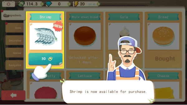 汉堡配方会逐步解锁,随着店铺的发展慢慢开启新的食谱