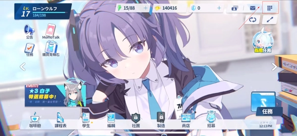 1、打开蔚蓝档案,点击右上角小方块打开菜单;