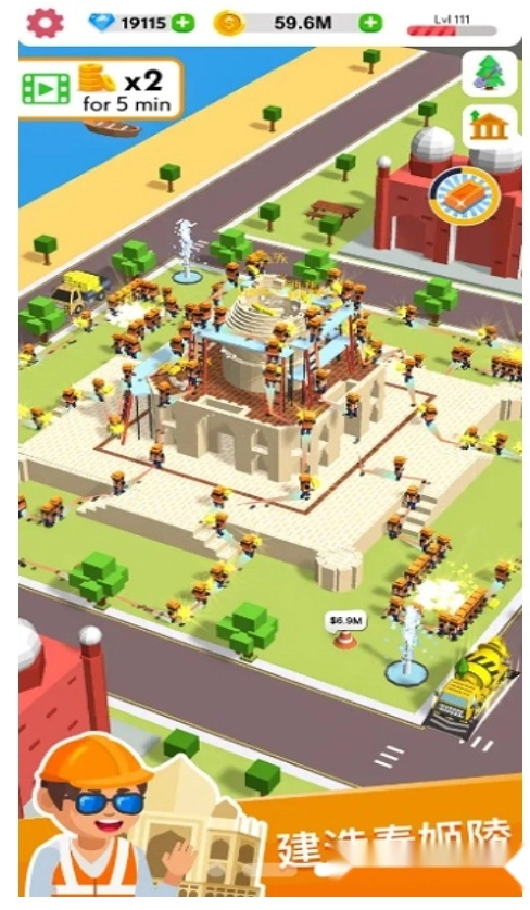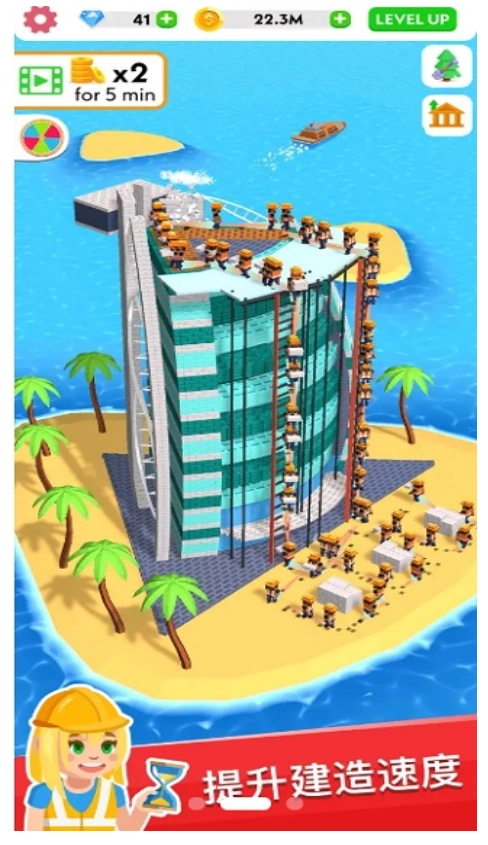 3、随着工程强度的提升,及时增加工人数量、提高工作效率等元素的等级也会变得十分重要。玩家的任务就是拼搭出一座座心仪的建筑物,完成更多挑战内容,为您带来超多乐趣。
