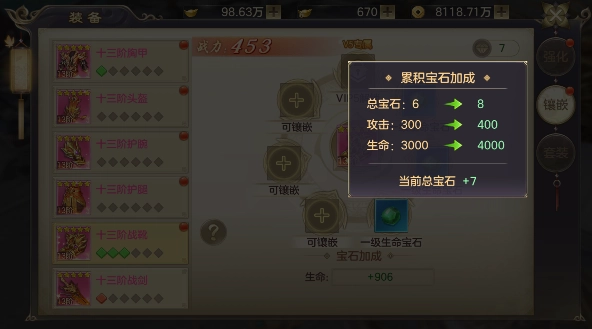 当装备的宝石等级总和累积到特定数值时,还能额外获得攻击与防御属性的加成。