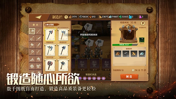 1. 装备的制造与售卖:玩家可进入英雄商店,在制造栏进行装备打造。依据左侧选定的武器类别及对应的图纸,明确所需材料后,点击制造按钮便能启动制作流程。装备制造完成后,玩家既可以将其出售给顾客,也可以让自己的英雄穿戴使用。