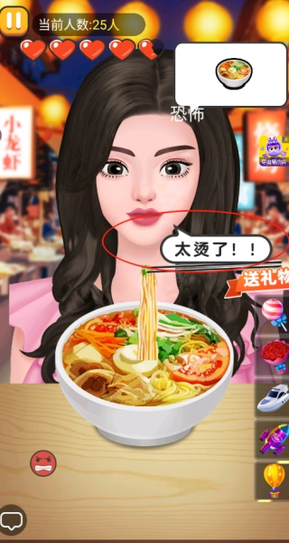 1、进入游戏后,点击并拖动筷子,夹起碗里的食物完成进食动作,开启第一场吃播直播,熟悉基础的互动逻辑。