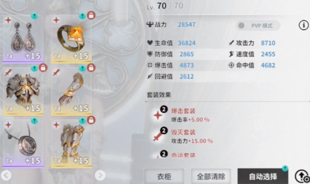 一套传说级别的四件征服套装(包含毁灭与命运),再搭配两件史诗级别的暴击套装(其副词条属性涵盖速度、暴击、爆伤和攻击)