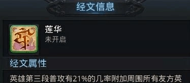 注解:莲华经文的效果和罗睺经文比较相似,如果对它不太了解,也可以把它看作另一种罗睺经文,二者的效果差异不大。罗睺经文的效果是释放技能后,下一次普通攻击会附带自身物理强度与法术强度总和16.5%的法术伤害;而莲华经文则是在第三段普通攻击时,有21%的几率附加周围所有友方英雄物理强度和法术强度总和0.5%的伤害。