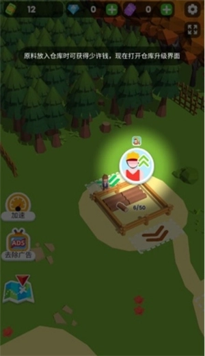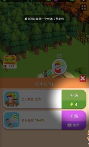 4、当钞票数量充足时,点击仓库升级界面,之后就能雇佣一名伐木工来协助你。
