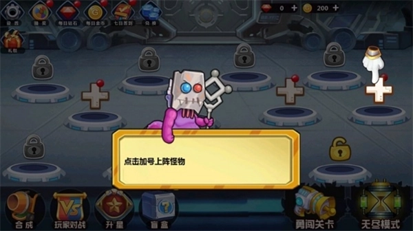 回主界面点击“+”添加小怪物上阵,近战建议放前排,远程与辅助放后排。