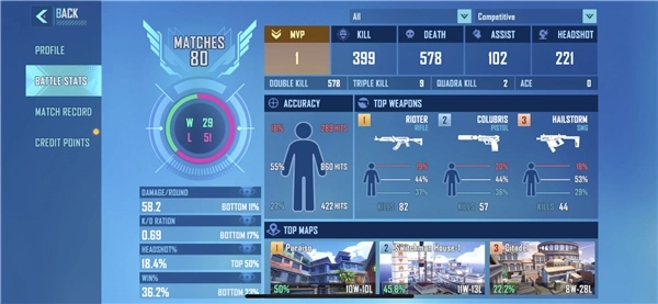 完善的玩家数据统计:在游戏中能够直接查看的玩家数据统计维度很完善,从个人的段位相关信息、MVP次数、信誉分情况,到玩家的KDA数据、不同地图上的胜负历史统计等应有尽有。
