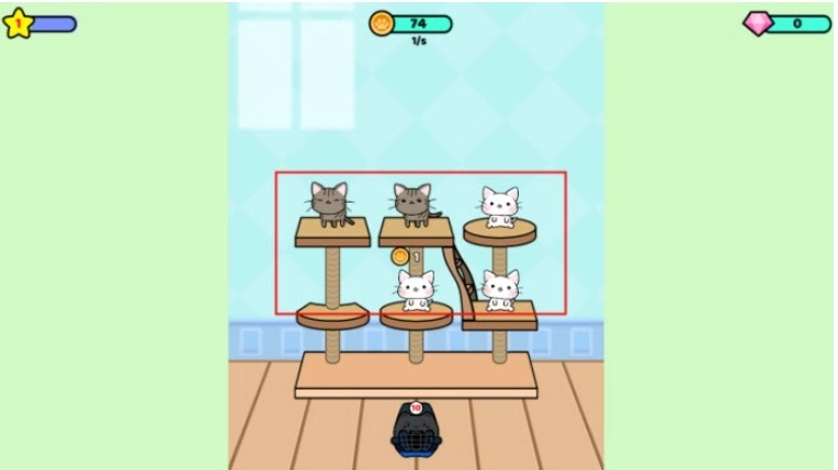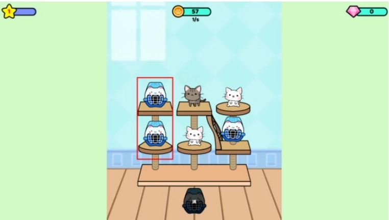 3、把两只同品种的猫咪拖到一块儿,它们就会自动合成更高级的猫咪。像白猫能合成灰猫,灰猫能进阶为花猫,解锁的猫咪品种越多,能获得的奖励就越丰厚!