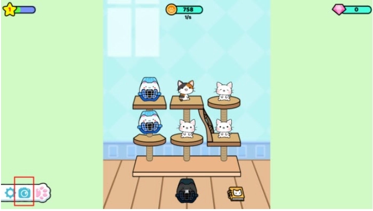5、游戏左侧的“猫爪”图标里藏着互动功能,点击相机按钮就能给你喜欢的猫咪拍照保存下来。你也能把照片存起来或者分享给好友,一同展示你最爱的猫咪组合!