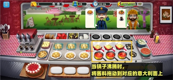 顾客有时需要在意大利面中加入配料,如番茄,奶酪,橄榄等。点击备菜区域上方的配料区,拖动对应的配料到意大利面中吧!