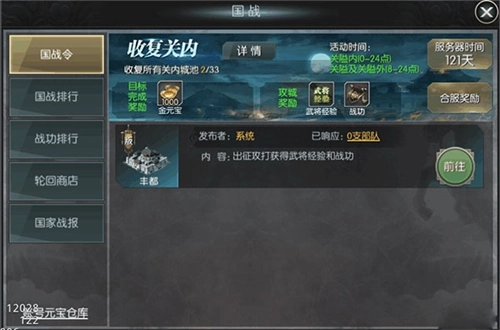 国战是主公快速提升战斗力的重要途径,通过参与国战系统完成相关任务,主公能够获取大量战功;这些战功可用于兑换升星材料、宝石、招募令、强化道具等资源,助力主公快速增强自身实力,为一统天下奠定基础。