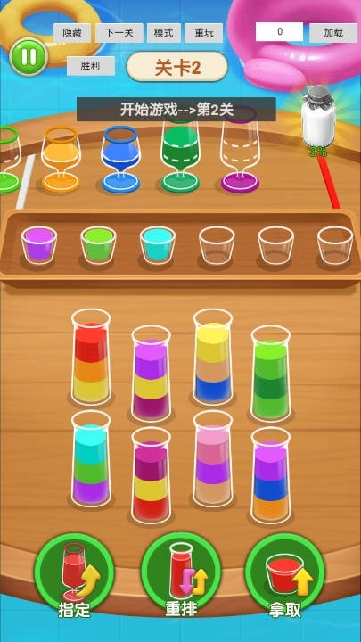 1、玩家需点击不同试管,把相同颜色的液体倒入对应的杯子里,每个关卡的液体颜色与试管编号均有差异。