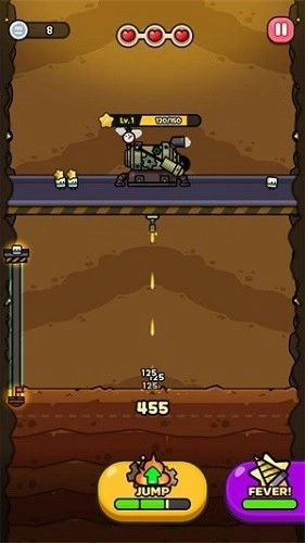 2、进入关卡后,挖掘机会自动向下行进,点击下方的“jump”按钮即可向上跳跃一段距离。