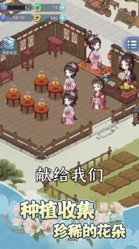 1、这是一款竖版古代鲜花小镇题材的养成游戏,采用的是佛系休闲的放置养成玩法。