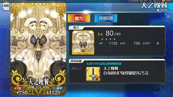这件礼装满级后ATK加成750、HP加成1125,满破技能可提升30%的NP获得率,是蓝卡队适用的礼装类型。和“秉持优雅”类似,它也属于单一加成礼装,30%的NP加成能让队伍快速积攒NP,因此更适合那些能通过卡牌或技能额外获取更多NP的英灵使用。