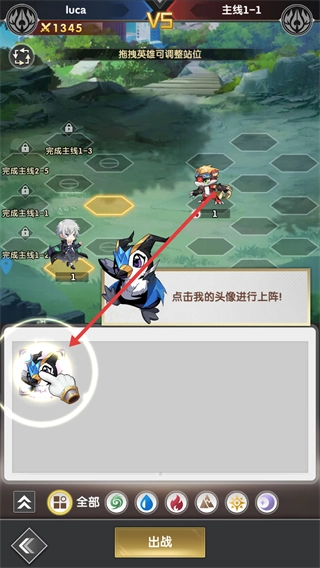 选择英雄头像上阵,拖拽英雄可调整站位。