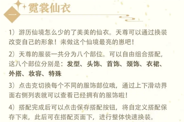 1、游历仙境怎能缺少美美的仙衣呢?天尊能够借助换装来改变自身形象!快来成为这仙境里最耀眼的存在吧!