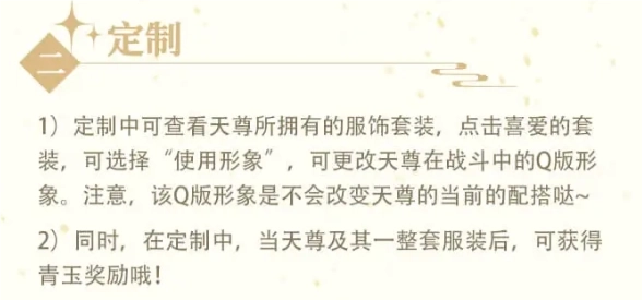 1、在定制界面中,你可以查看天尊已拥有的服饰套装,点击心仪的套装后选择“使用形象”,就能更换天尊在战斗场景里的Q版外观。需要注意的是,这个Q版形象并不会对天尊当前的装备搭配产生影响哦~