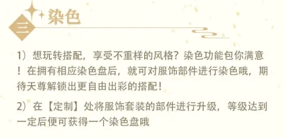 1、想要轻松玩转穿搭,每天都能拥有不重样的风格?染色功能绝对能让你满意!只要拥有对应的染色盘,就能对服饰部件进行染色啦,期待天尊解锁出更自由、更出彩的搭配!