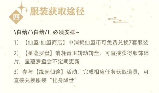 1、【在【仙盟-仙盟商店】里,使用仙盟币能够免费兑换7套服装。