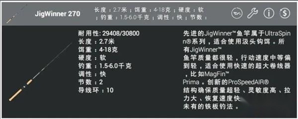 一般后期作钓中常用的直柄路亚竿包括JigWinner 270(我们通常也叫它小270)。这款小270的优势在于其2米7的长度,搭配小克重假饵时能抛出30到60米的距离,很适合针对小体型鱼类展开精细作钓,一般用来钓4公斤以内的鱼,若鱼的重量超过4公斤,作钓起来就比较费力了。