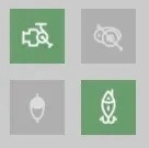这个图的左上角是纺车轮的使用标志,右上角是水滴轮的使用标志,左下角是浮子的使用标志,右下角是路亚假饵的使用标志。通常情况下,大家选择轮子时只需根据鱼竿的拉力大小来搭配合适的轮子就可以了,等进阶之后才需要结合目标对象鱼的习性,去挑选不同收线速度的轮子。