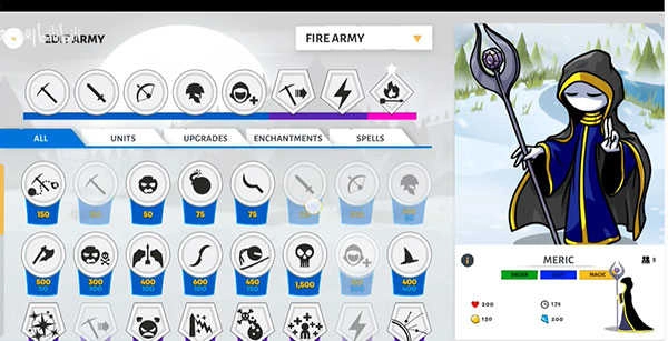 第五关的策略是剑士反击:安排4名矿工负责采集,剩下的人口全部用来训练剑士。这时候剑士的头盔装备已经升到满级,足以压制对手。