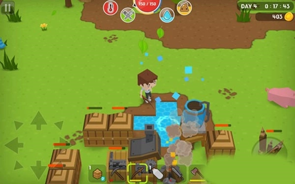 3、撑过第一个晚上,第二天就得把净水器造出来,这时候需要用铁块来制作铁桶。要是不这么做,你可能撑不到第三天早上。净化水的步骤是:站在水塘旁边,选中铁桶,点击右侧的按钮就能打水。接着对准净水器打开操作界面,按住铁桶拖到界面左边的栏位,系统就会自动开始净化。取水可以用玻璃瓶或者铁桶,选中对应的容器后,下方的【OK】按钮会亮起,点击它,净化好的水就会流进铁桶或玻璃瓶里了。 4、到了第三天,必须把厕所建起来,不然也会没命。