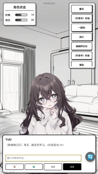《妹居物语》是一款深度融入AI技术的生活与恋爱模拟游戏,玩家将和妹妹Yuki共同生活,借助实时对话、赠送礼物、更换装扮、趣味小游戏等多种互动方式增进彼此的好感度,从而开启更多故事篇章。Yuki并非设定固定的角色,她能够记住玩家的对话内容、个人喜好以及日常习惯,其性格会随着互动过程逐渐发展,呈现出可爱、傲娇或是病娇等不同风格。游戏了时钟系统,该系统与现实时间保持同步,在不同的时间段和节日里,会有独特的对话内容与互动场景。除此之外,游戏还设有日记系统、多种结局设定以及丰富的自定义选项,力求为玩家打造沉浸式的游戏体验。