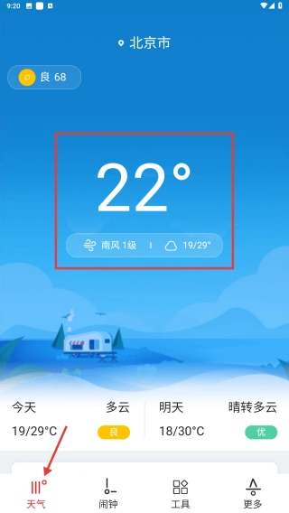 打开综合类应用,进入天气页面查看北京市的天气情况,包括当前温度22°、南风1级等信息。