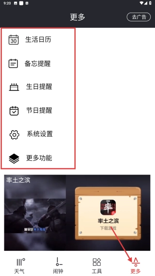 点击底部的更多选项,进入更多功能页面后,你可以使用生活日历、备忘提醒、生日提醒等各类生活相关功能。