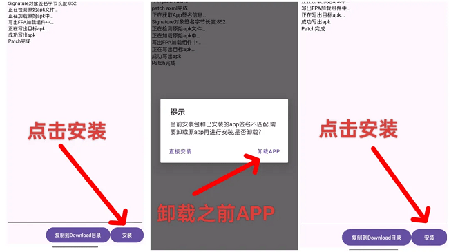 完成上述步骤后,点击“安装”按钮。这时系统会提示当前安装包和已安装应用的签名不一致,得先把旧版本卸载掉。点击“卸载”按钮移除旧版本,卸载完成后,再次点击“安装”按钮就能继续安装新版本了。