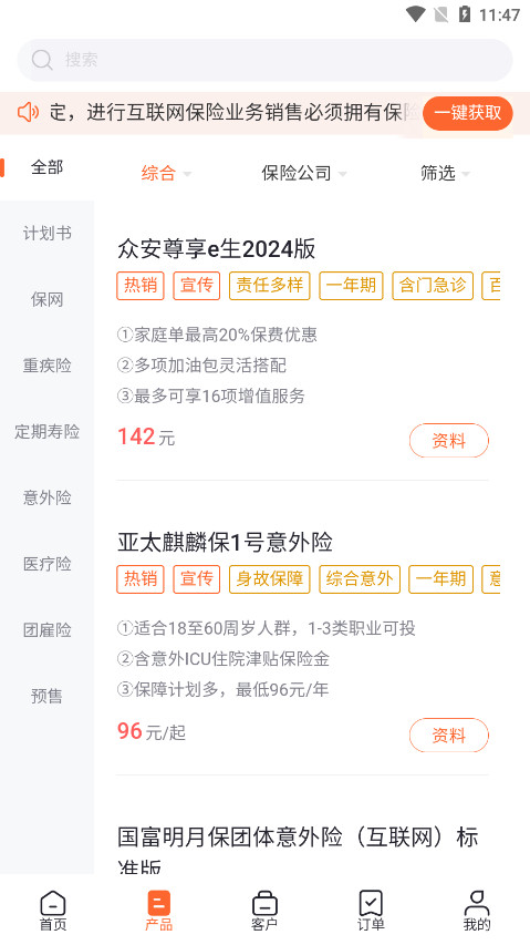 多样化产品可满足不同客户的需求,上新与停售通知发布及时,产品列表清晰明了,产品资料详尽全面。系统会自动记录投保流程中填写的信息,生成订单号后,就能在【订单】板块进行查看。该系统支持个险、团险等各类订单,还能对投保、核保等不同交易状态的订单进行跟踪,同时提供历史订单查询功能。