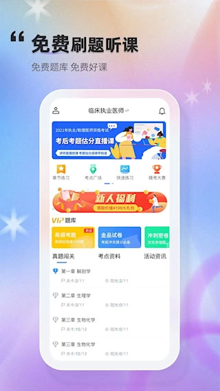 平台拥有百万级别的精选医学题库,涵盖执业资格、职称考试等九大领域。每道题目都配有视频解析和记忆口诀,用户可免费进行练习与听课学习。