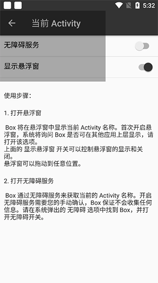在首页点击“当前Activity”功能,就能开启无障碍服务与悬浮窗权限。