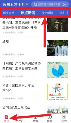 点击首页底部的资讯按钮后,就能浏览热点新闻、稼乡五常等不同频道,从而获取本地最新的权威资讯内容。