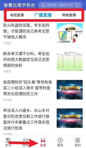 进入直播页面后,可在顶部选择电视直播、广播直播或网络直播,随时随地观看实时新闻节目。