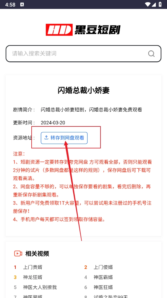 接着挑选需要的短剧进入详情页面,点击“转存到网盘观看”按钮。